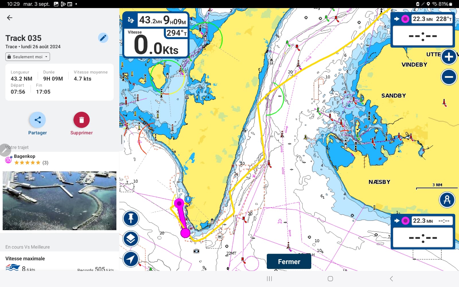Lundi 26.8: Bagenkop à Vejro – 43mn. 6 puis 5 puis 4 bf (S-SW)