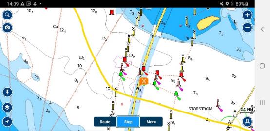 A noter : les différents chenaux pour les cargos et les ferries : Rute T et Rute H en haut à gauche et le croisement complexe à l’est de Gedser (milieu de la carte). Voir aussi les informations pour le pilotage des gros.