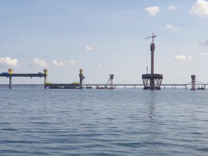 Nouveau pont en construction. Les éléments sont amenés en barges et hissés en place. |