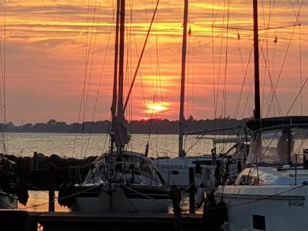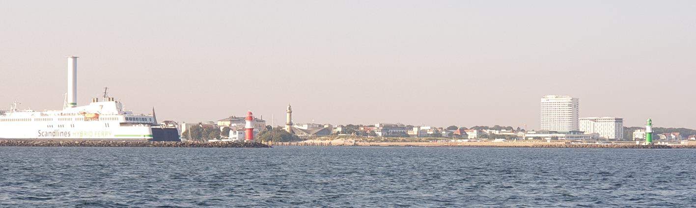 Départ de Klintholm à 8h15 (comme d’habitude, Karin va se doucher vers 06h30, Je m’habille, on déjeune à son retour, Müsli café. Puis on prépare le voilier : enlever les élastiques qui empêchent les drisses de taper, attacher la drisse de GV, enlever le câble électrique, repasser les amarres si nécessaire, remonter les pare-battages sur le pont, bon c’est vrai, j’aurais pu le dire au début). Nous quittons la place et faisons un petit tour à l’intérieur des jetées pour hisser la GV à l’abri des vagues. A 8h30, les voiles sont établies. Cap au 198, vent petit-largue SO 5 (vidéo), puis W 4 (7.5 m/s à 9 m/s). Belle descente au sud (à 7 nds, la vitesse varie entre 5 à 8, au largue) soleil, soleil. 16h, affalage des voiles devant la plage. Amarré au ponton à 16h30 à Hohe Düne. Les sanitaires sont sur un petit ponton flottant, lui-même amarré au ponton du port, sur un équivalent de 3 places de port, super confort. Gin Tonic à la Hohe Düne Resort. Puis marche dans Warnemünde (traversé le canal avec un bac, monstre trafic de monstre cargos et ferries, pilotes et remorqueurs). Mangé près du vieux phare (Pfannenkuche vraiment moyen). Magnifique coucher de soleil. |
