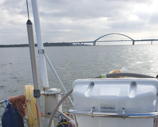 Magnifique bord à la voile vent de travers (SW 3), nous empruntons le chenal Smalandsfahrwasser qui mène à l’entrée du passage plus étroit. Passé sous plusieurs ponts, le premier en construction, au sud de l’ile de Kopenhagen. Gros trafic routier sur le pont le plus à l’est.